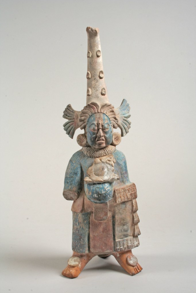 This blue-painted ceramic figure looks like he’s mid-complaint, mouth open, brow set, very “get off my lawn” energy. His armor-like bodysuit, shield, and heavy ornaments mark him as a warrior or elite type. He’s also a whistle, because apparently even sour puss warriors double as musical instruments.