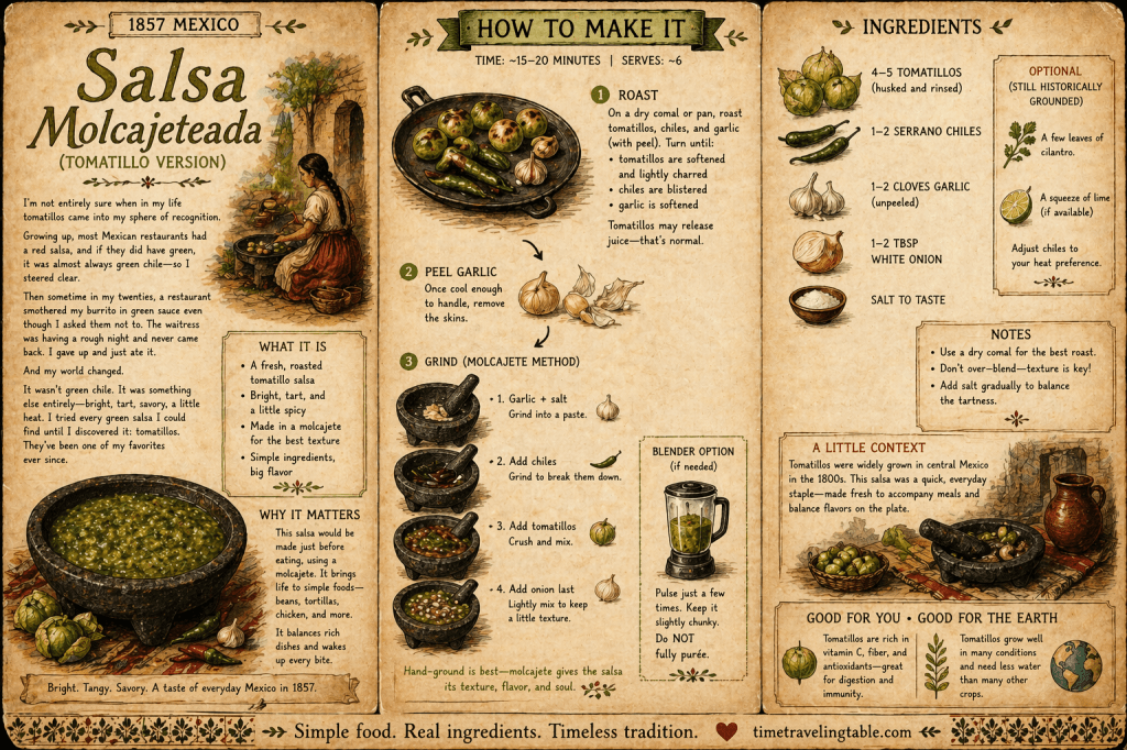 And that tracks, because in 1857 Mexico, tomatillos were everywhere. They grow easily, store well enough for short periods, and bring a completely different kind of flavor than dried chiles. Where red sauces lean deep and warm, tomatillo salsas are brighter, sharper, and meant to wake everything else up on the plate.